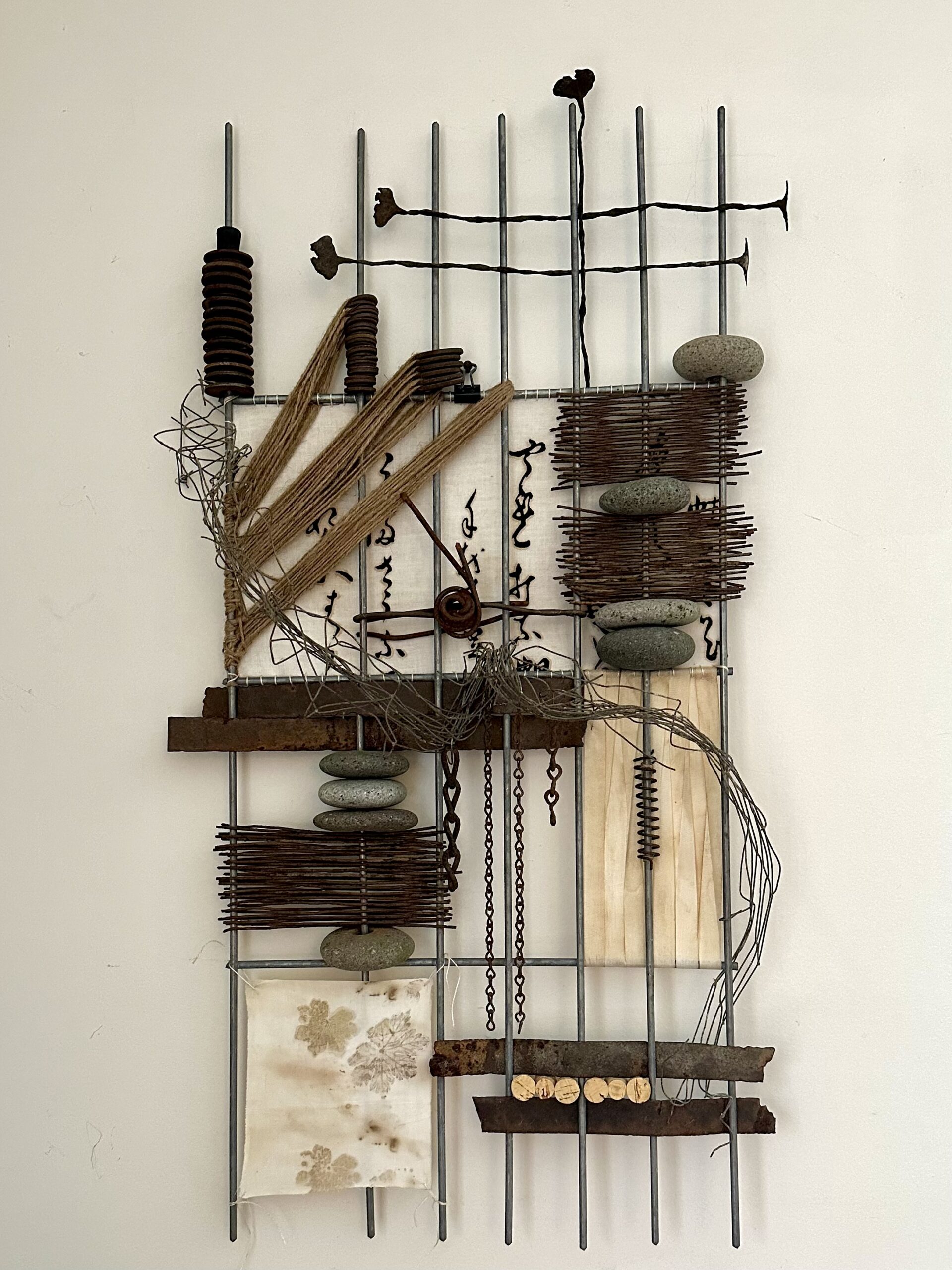 Piano wires wind around a fence panel draped with eco-printed and ice-dyed fabric. Various weathered metal pieces are scattered within the structure.